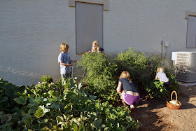I purposefully did not harvest anything on Saturday or Sunday so the kiddoes would have plenty to pick. I didn't get a picture of the basket when they had finished, but it was over-flowing with tomatoes. Everyone took home a large bag of tomatoes, plus some squash.
